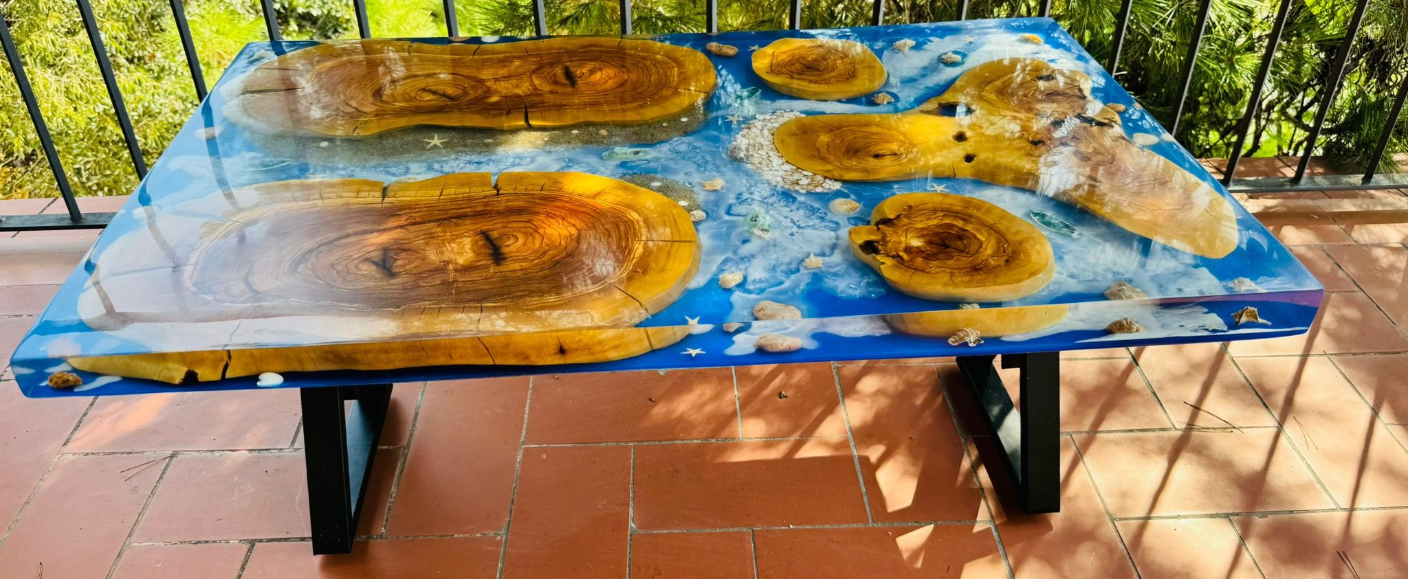 – Piezas de madera natural integradas en resina azul.